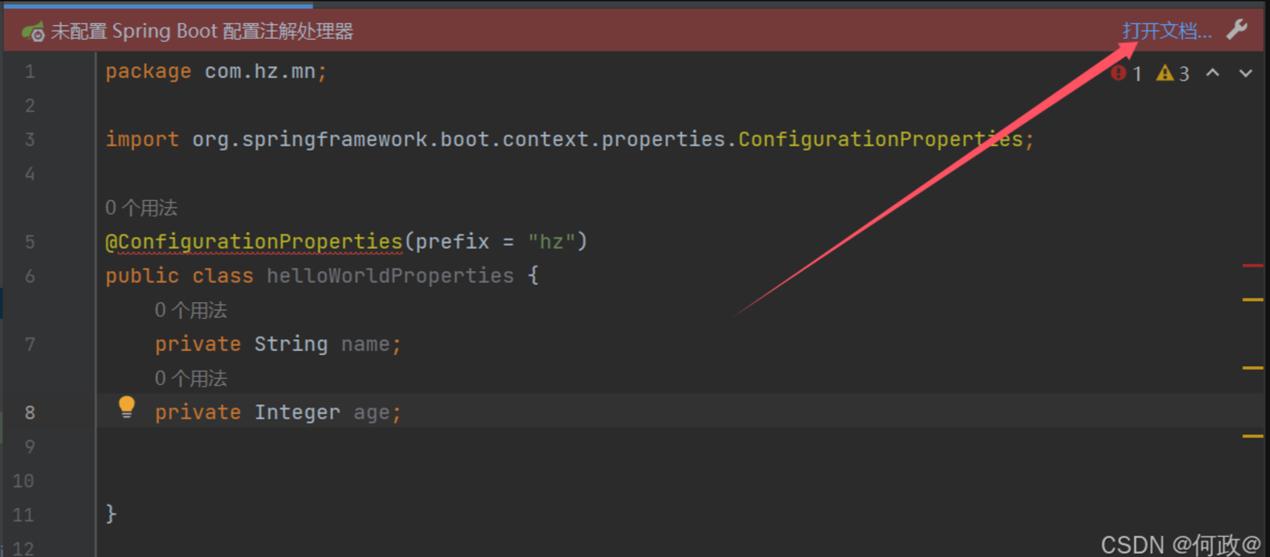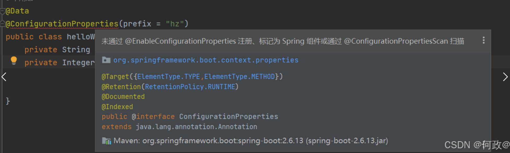 age: 18定义一个helloWorldProperties类,通过@ConfigurationProperties注解。这个注解用于将配置文件中的属性绑定到Java Bean上,很方便地在Spring应用程序中使用这些配置属性。